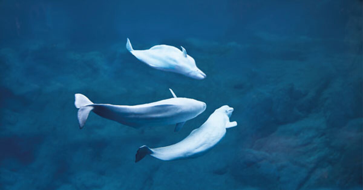 تسبح حيتان البيلوغا من حولنا و تظهر باجسادها الناعمة فوق الماء.