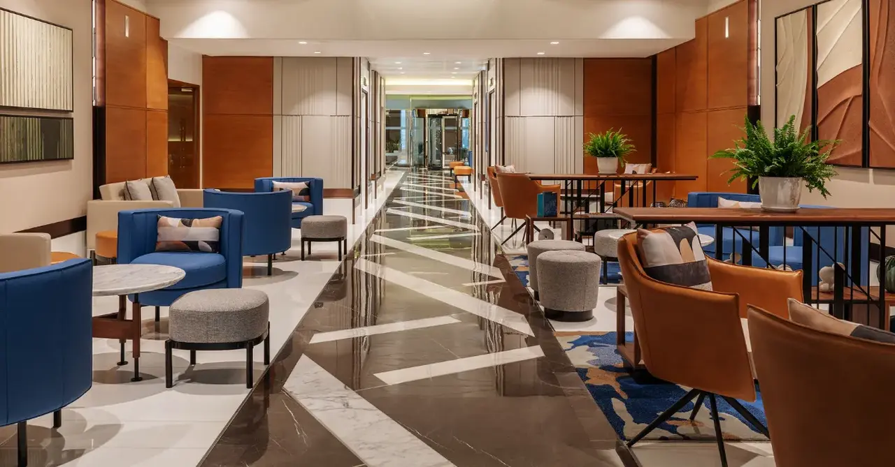 أُعيد تصميم المساحات العامة ومساحات الضيوف لتعكس مفهوم "مكان التجمع" الخاص بفندق شيراتون، مما يشجع على التفاعل الاجتماعي والإنتاجية. ويضم الطابق السفلي الآن طاولات مشتركة مزودة بشحن لاسلكي مدمج، ومقصورات عازلة للصوت للعمل المركز، واستوديوهات متعددة الاستخدامات يمكن تحويلها بين اجتماعات وتناول طعام خاص.