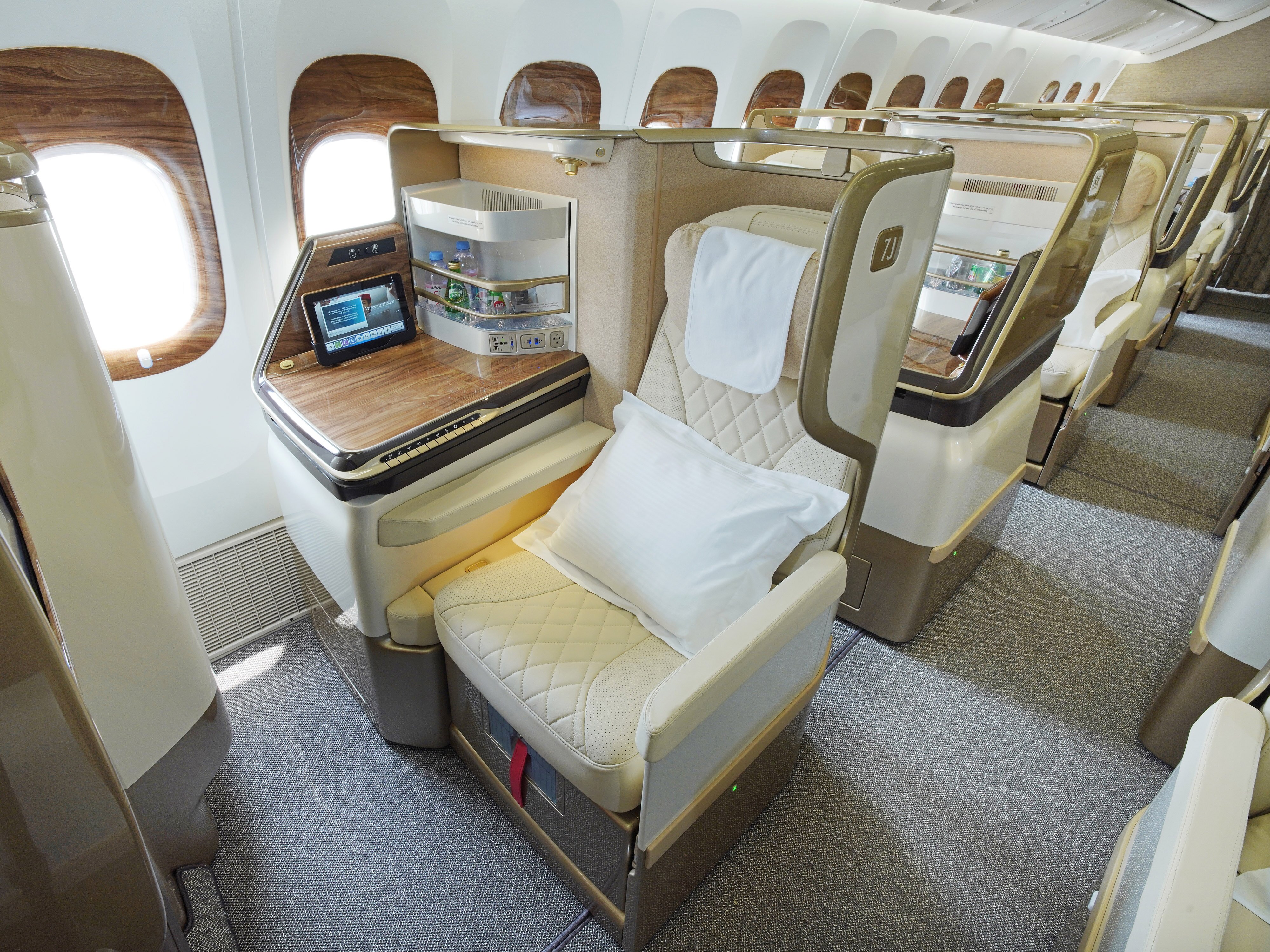 توفر مقصورة درجة الأعمال الجديدة في طائرة الإمارات 777 للركاب 38 مقعداً مع تنجيد جلدي ناعم باللون الكريمي مزين بلمسات بلون الشامبانيا وألواح خشبية أخف وزناً وتكنولوجيا محسنة.